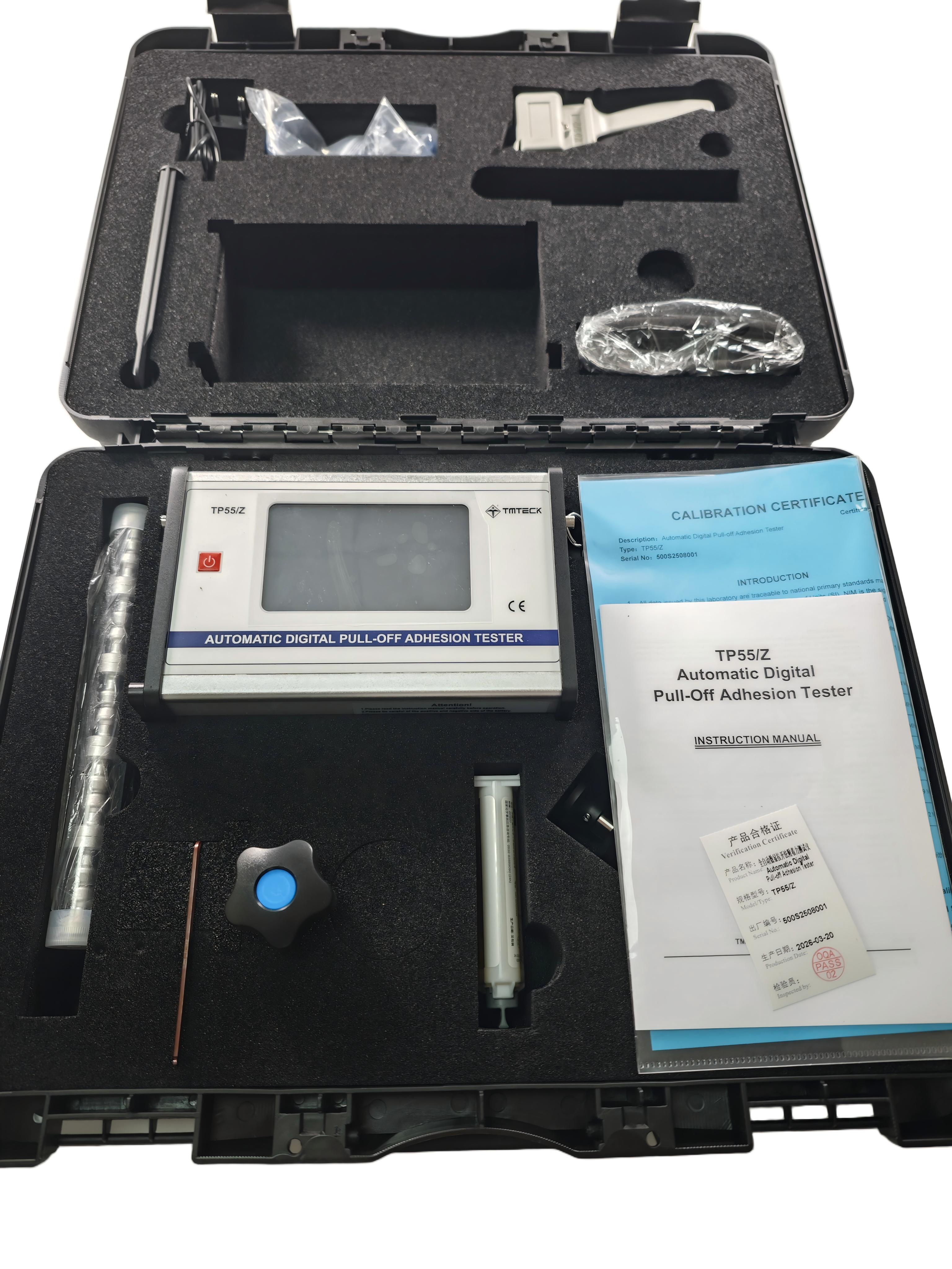 Teste de adesão digital TP55É um instrumento portátil a mão utilizado para medir a força necessária para afastar um diâmetro de ensaio especificado de revestimento do seu substrato, utilizando pressão hidráulica.A pressão é exibida num LCD digital e representa a resistência de adesão do revestimento ao substrato.